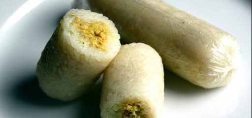 Kleefrijst rolletje gevuld met gekruid kippen vlees of met gekruid gehakt